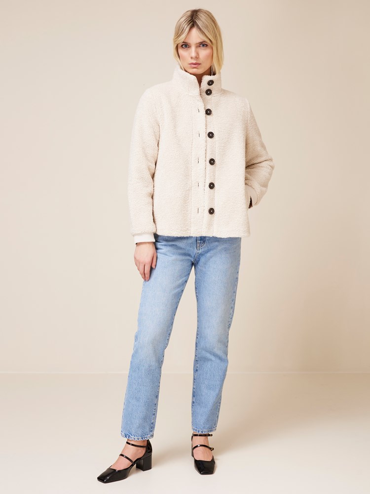 Jakke i myk pile med skorsteisnkrage og passepoilerte stikklommer i siden. Jakken knappes i front med mørke hornfargede knapper, har ribbestrikket mansjett, tab i siden og badge på ermet. Innvendig nakkehempe, og rett avslutning i kanten nede. Modellen er 179 cm høy og har på seg str S.