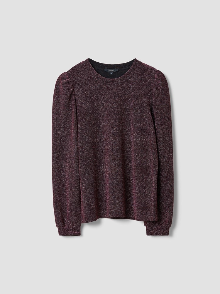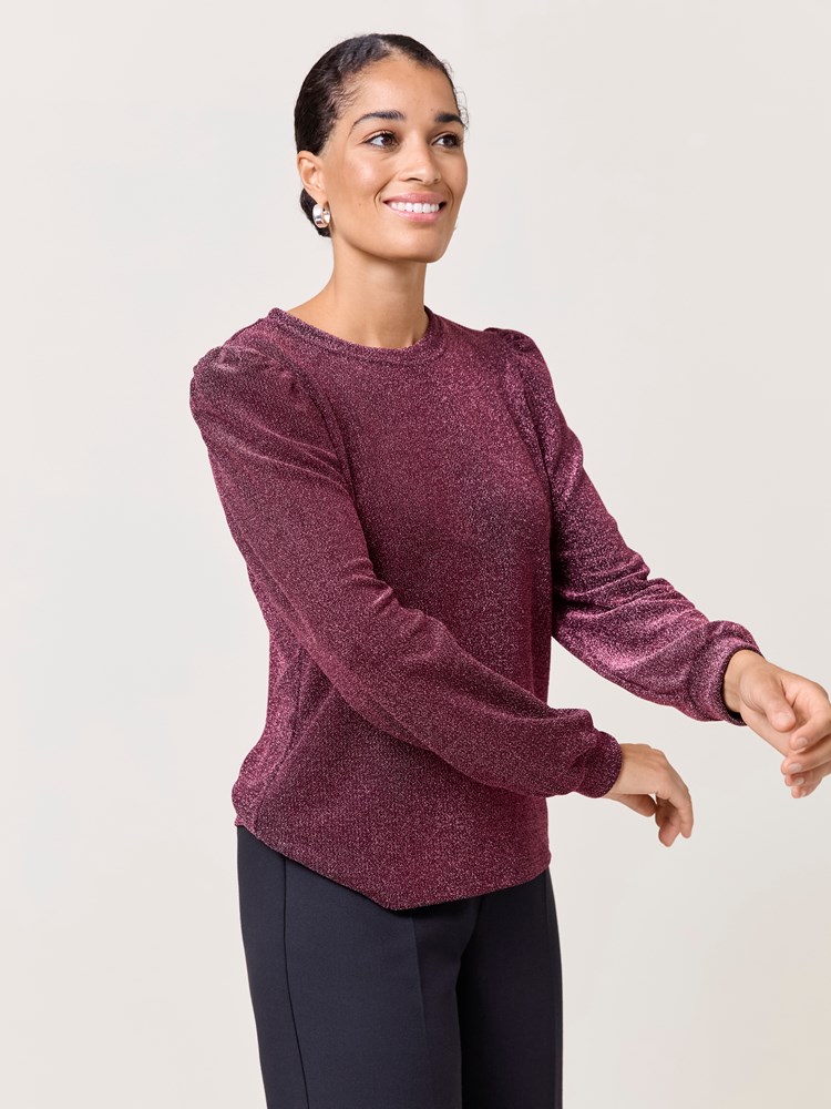 Jerseytopp i mykt lurexstoff med rund hals og ledig passform. Toppen har vide ermer med en liten skulpturell pufferm med elastisk mansjett nederst.