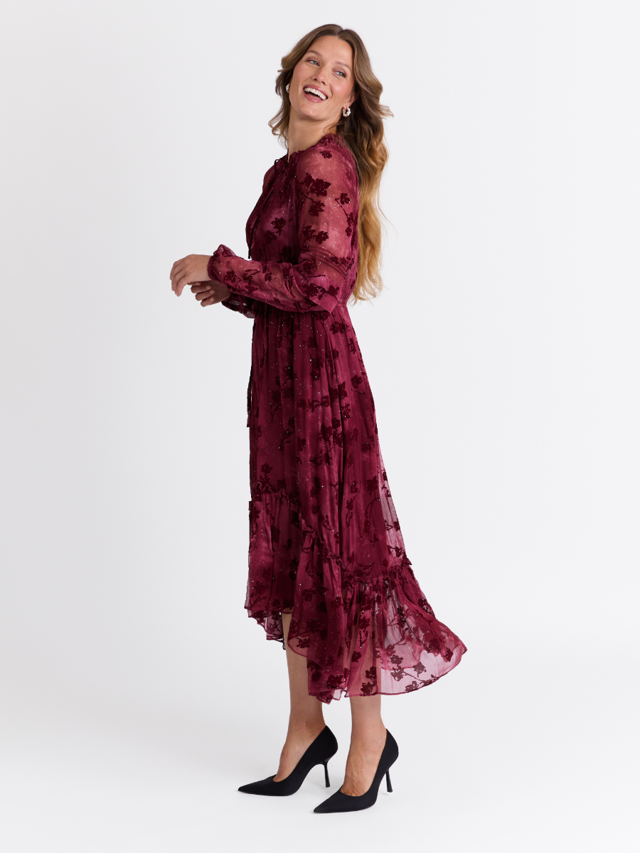 Andrea kjole fra Marie Philippe i strukturert viskose og fløyelsmønster gir et elegant uttrykk som passer like godt til julebordet som til nyttårsfeiringen. Style kjolen med enkle gullsmykker og nøytrale sko for et balansert og glamorøst antrekk.