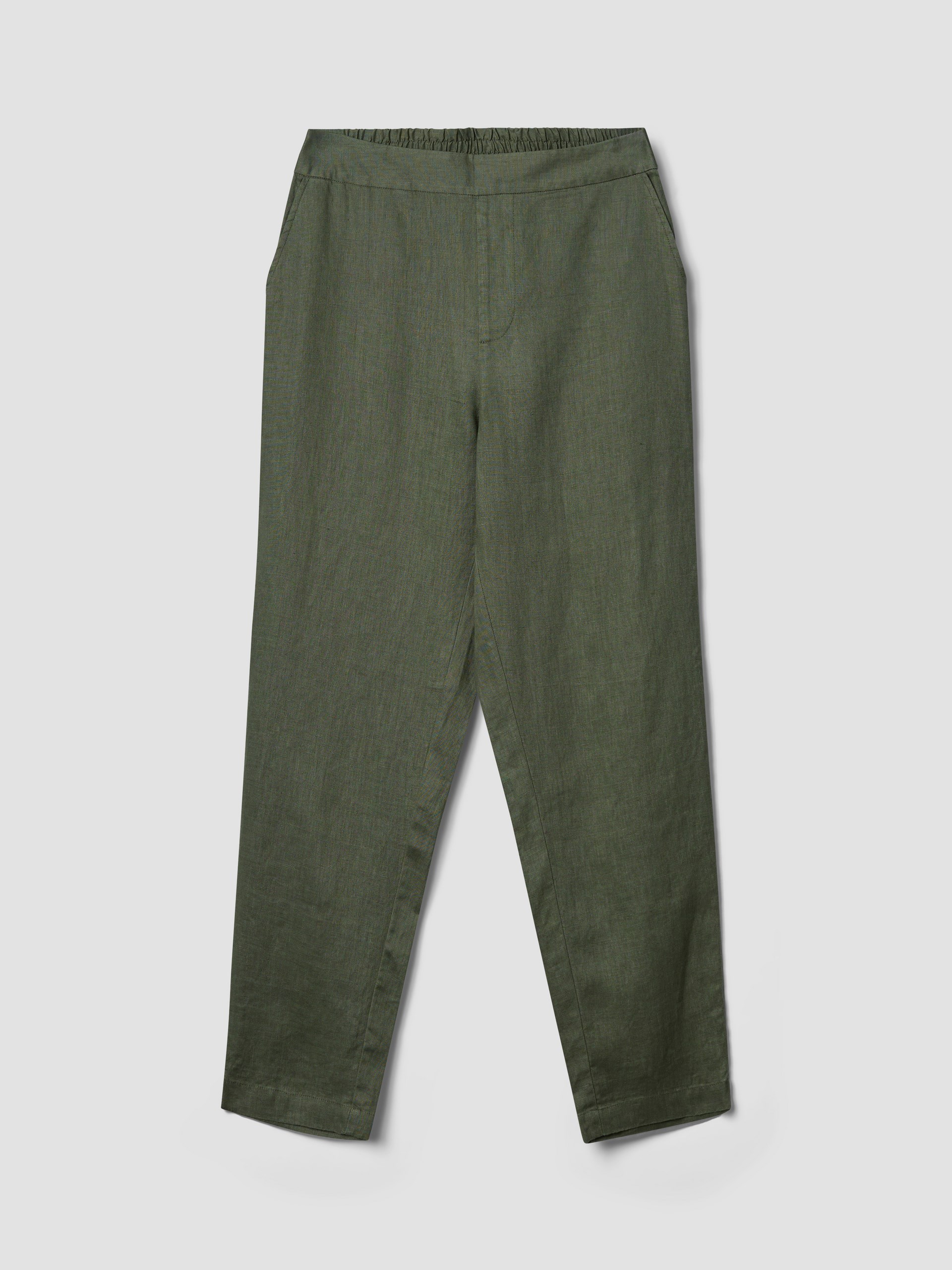 Bukse i lett linkvalitet med normal livhøyde og elastikk i livet.