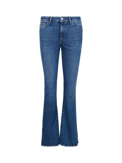 Behagelig jeans med high waist, glidelåslukning, og sleng med splitt nederst i sidesøm. Buksen har et steinvasket uttrykk med slitasjeeffekter, blå etikett med logo i livet bak og kontrastdetaljer. Innerbenlengde i str M er 81 cm. Lengden vil variere 1 cm opp og ned i størrelse. Passform: Smal setevidde og tettsittende silhuett med sleng fra kneet og ned. Materiale: 12.7 OZ denim i en mellomblå indigo innfarging med god elastisitet.