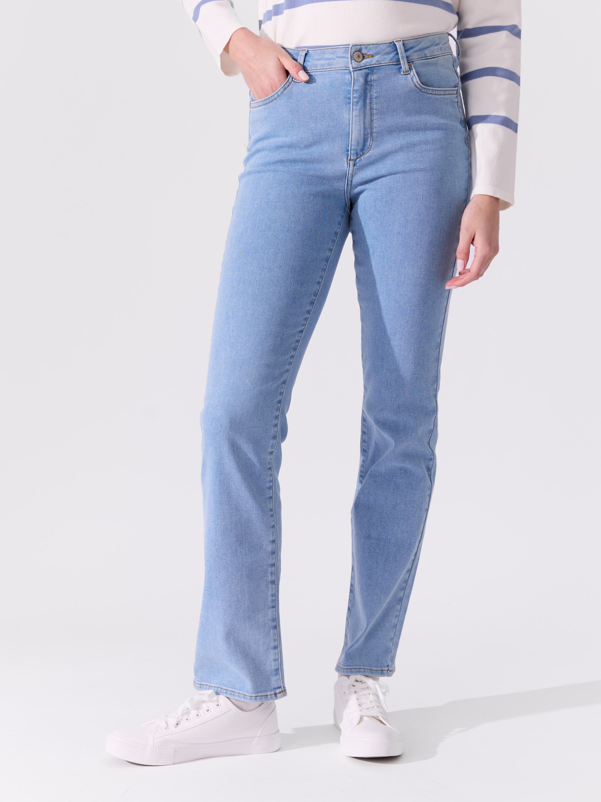 Sophia Straight er en jeans i mellomblå 11,5 oz denim med god elastisitet. Modellen har høyt liv og smal passform over sete og hofter, som gir en tettsittende silhuett ned til kneet der benvidden blir rett.