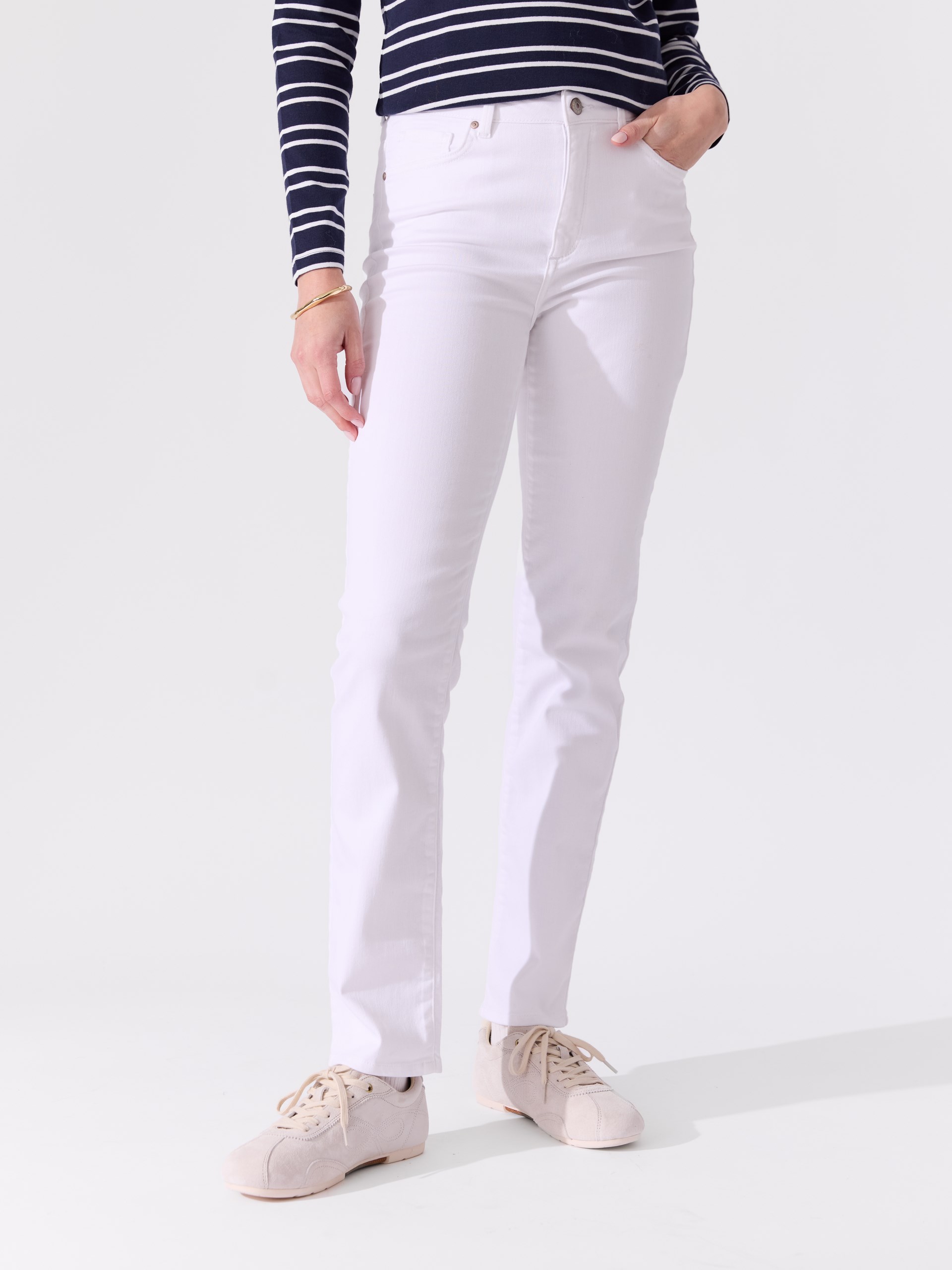 Sophia Straight er en jeans i hvit denim med god elastisitet. Modellen har høyt liv og smal passform over sete og hofter, som gir en tettsittende silhuett ned til kneet der benvidden blir rett.