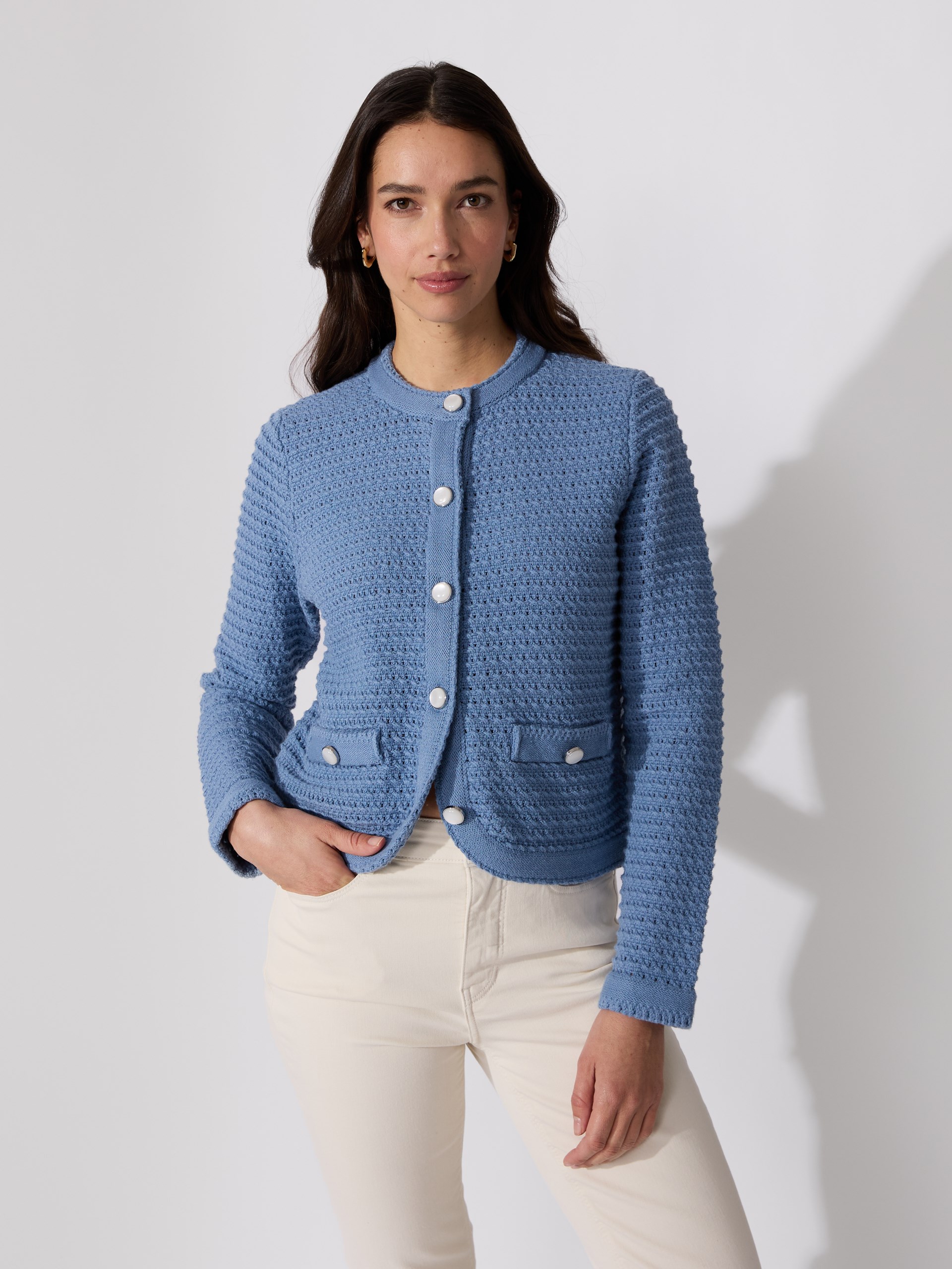 Lett og feminin strukturstrikket cardigan i bomullsblanding. Cardiganen har små lommer, rund halsåpning og rett passform