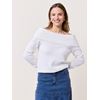 Myk genser i bomullsblanding med innslag av ull og nylon. Genseren har bred vrangbord som kan brukes som off shoulder. Feminin passform med raglanerm og ribbestrikkede vrangborder