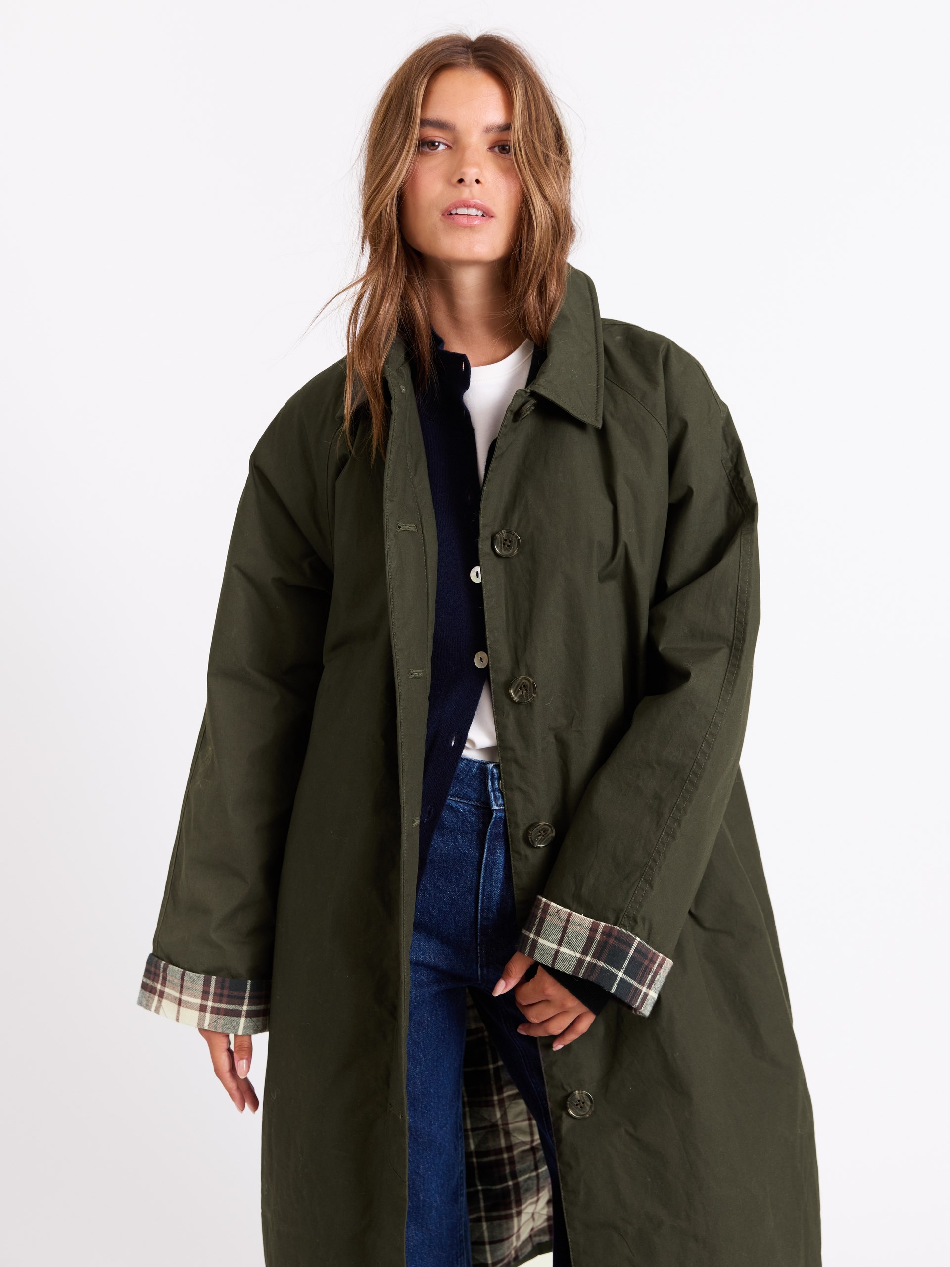 Komfortabel kåpe med vokset "oilskin" look av behagelig vaskbar Better cotton bomull.