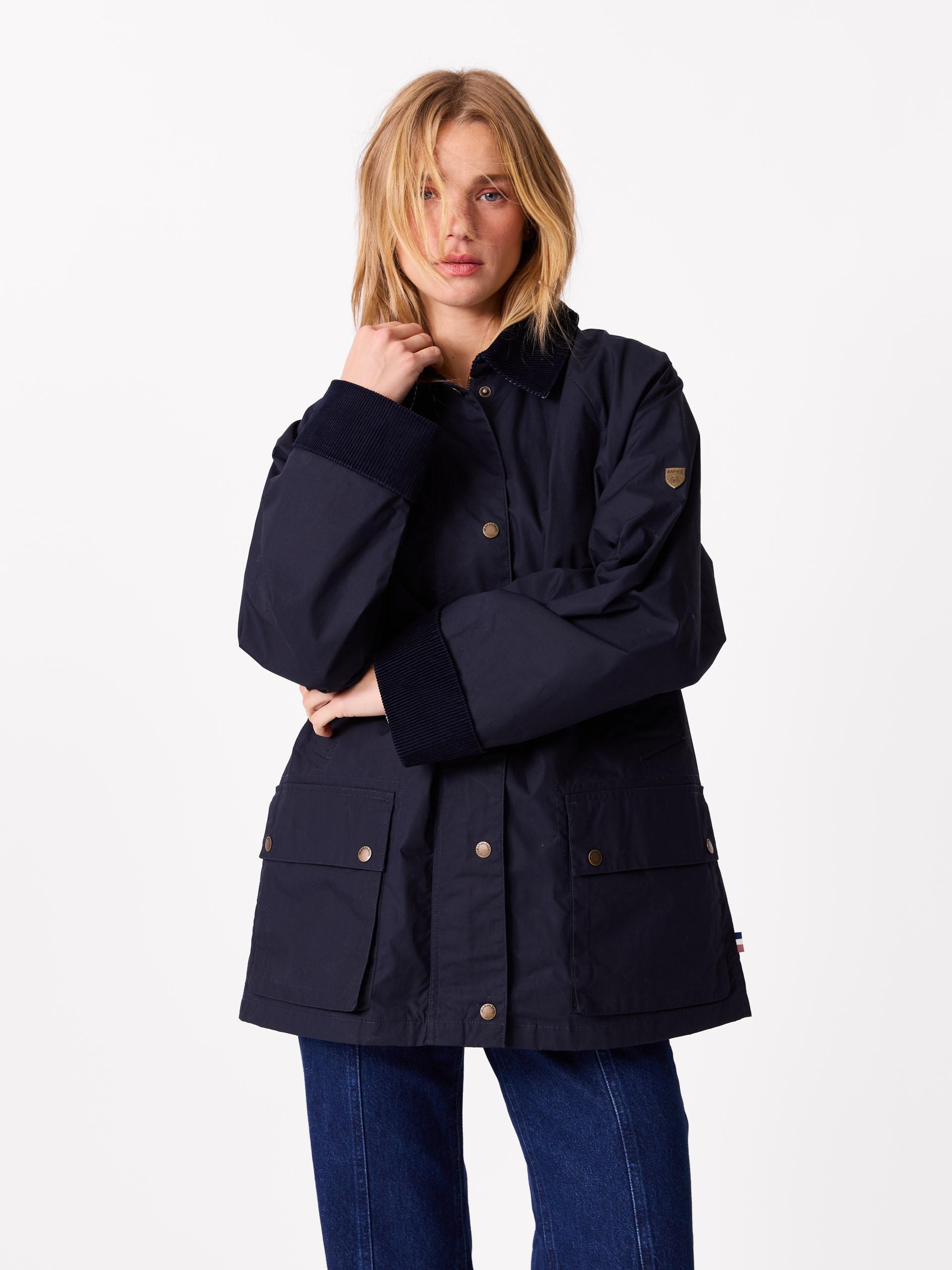 - Kontraststoff i cordfløyel av Better cotton bomull på kragen og ermet