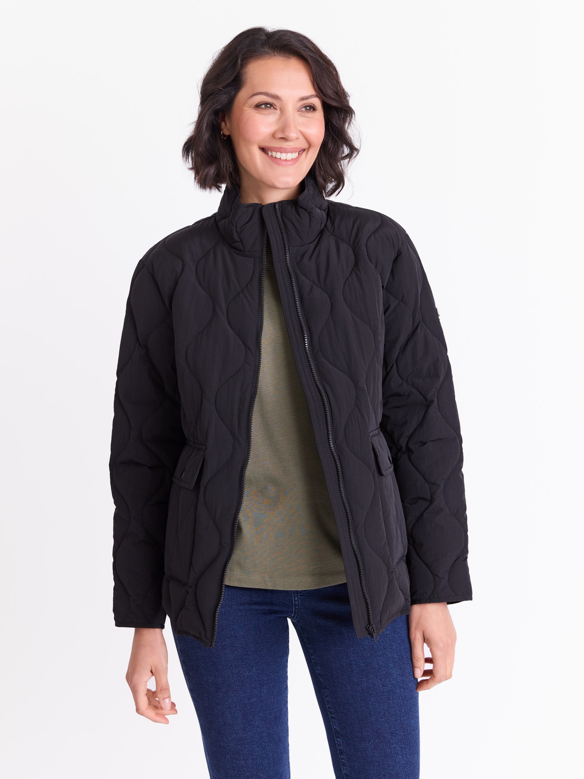 Lukk glidelåsen, vask med vrangen ut. Tørketromles på lav varme med tennisballer, rist jakken underveis for å jevne ut vatteringen. Fôr: 100% polyamid -resirkulert. Vattering: 100% polyester - resirkulert