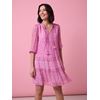 Småmønstret kjole i lett viskosechiffon med liten rysjekrage, v utringing med knyting og små sydde legg i front. Kjolen har 3/4 lang erm med elastikk, fôr i kroppen og ledig passform
