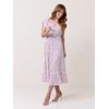 Lang kjole i 100% LENZING ™ viskose med langt kappeskjørt, kort erm og elastikk i livet. Kjolen har firkantet elastisk utringing som kan brukes off shoulder om ønskelig. Knytesnor med dusk og splitt i front.
