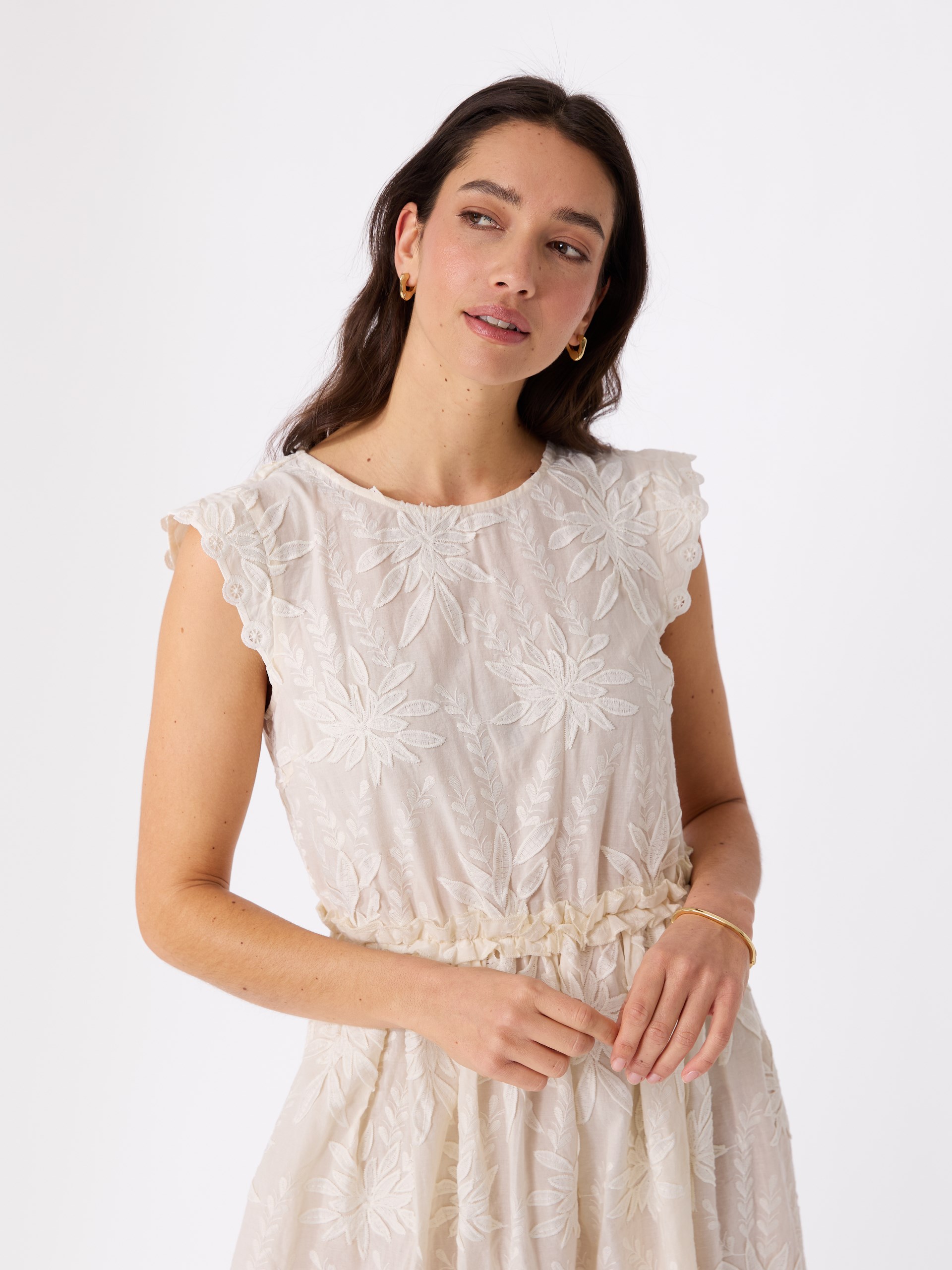 Kjole med ton i ton broderi og feminin rysjedetalj i livet