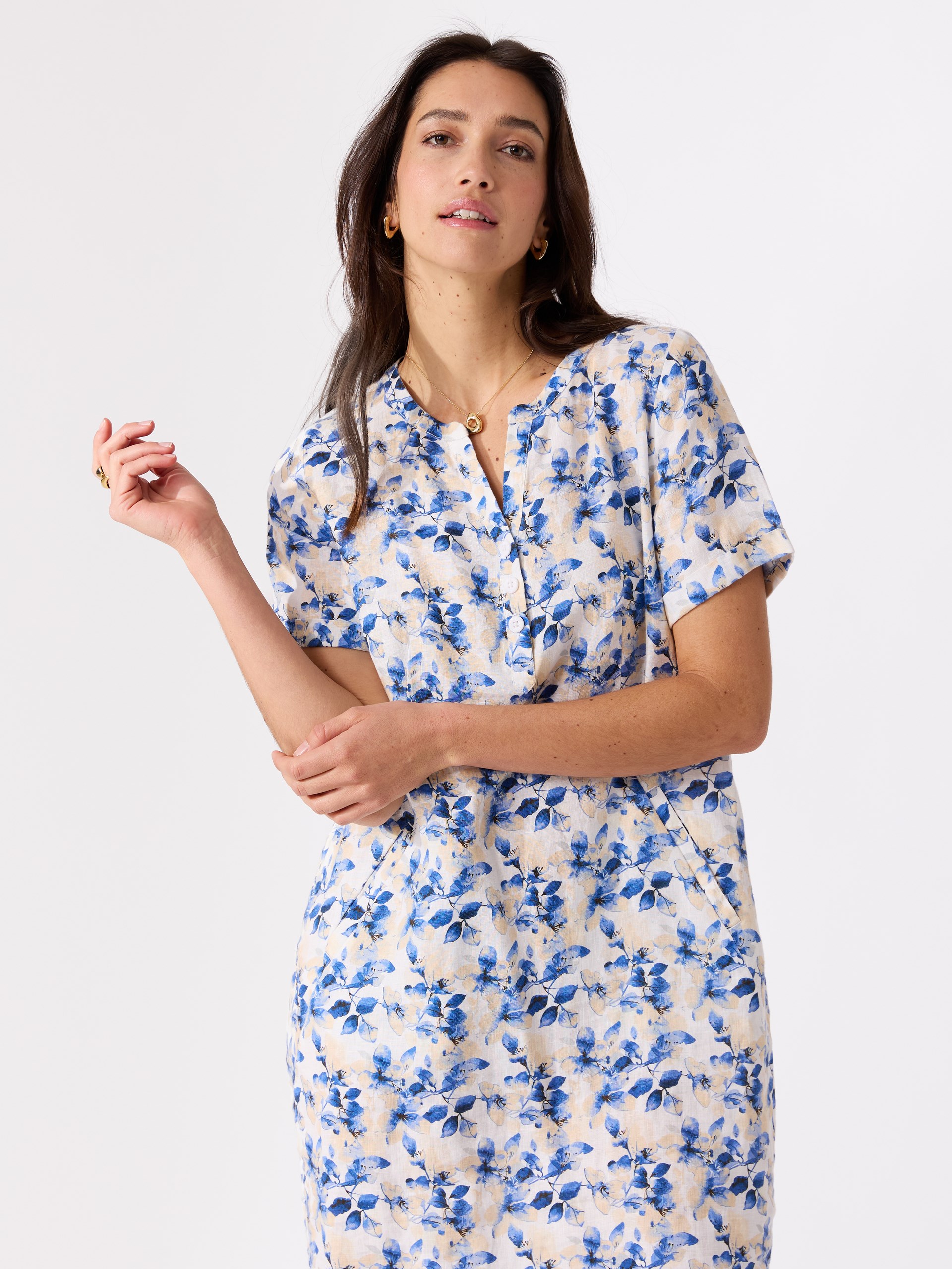 V-utringet mønstret kjole i behagelig vasket lin.