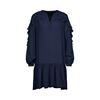 Kjole i behagelig viskosekvaliet med v utringing, liten krage og volang detaljer i front og langs ermet. Kjolen har lang erm med vidde, rynket bærestykke bak, A line fasong, god vidde og kappe nederst.