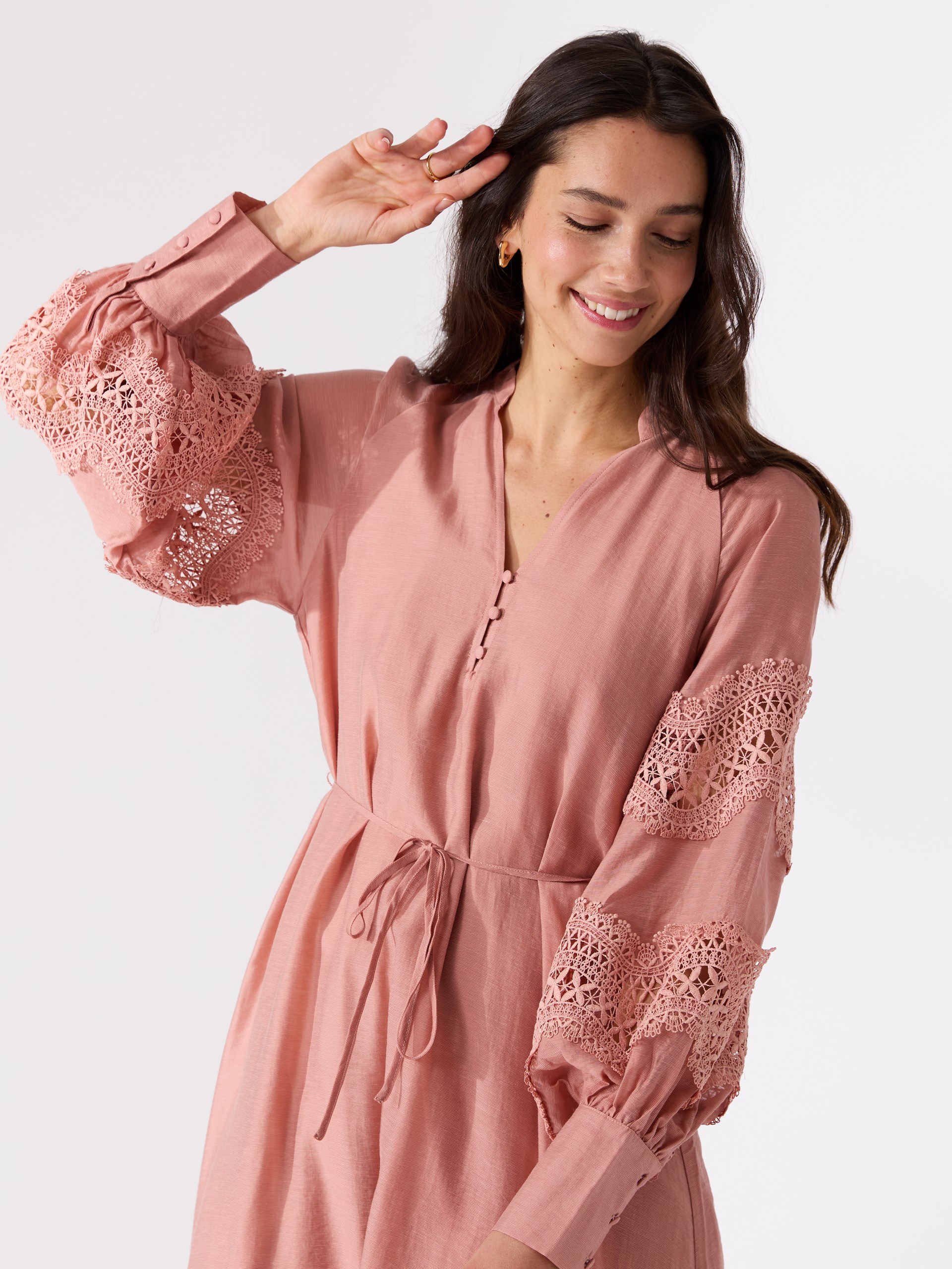 Delikat kjole i viskoseblanding med generøs blondebesetning.