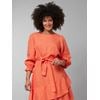 Vakker linkjole i lett og behagelig lin-bomullsblanding med rund hals, knapp og splitt i nakken og puffermer med vidde og rysjekant med elastikk nederst. Kjolen har innsnitt ved brystet, lett utskrådd fasong, løst knytebelte i livet og kappe med skråsøm. Metallbagde med logo nede på siden og lengde ca til kneet. Modellen 176 cm høy og bruker str M.