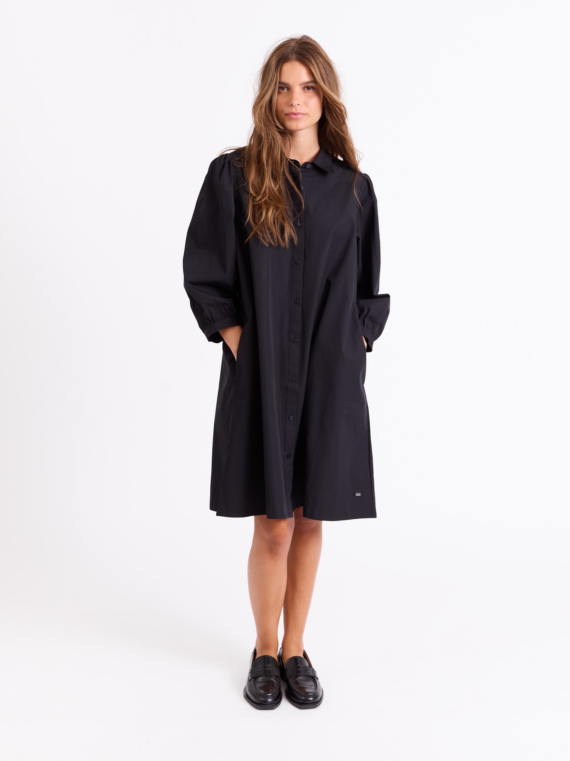 Poplinkjole i utskrådd passform med 3/4 lang pufferm og knappet mansjett