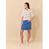 Patty skjørt er laget i en mellomblå indigo denim med et steinbleket lyst uttrykk. Materialet har en behagelig elastisitet, som gir god bevegelsesfrihet. Skjørtet har glidelåsgylf og knapp i linningen, samt kontrastdetaljer og skinnetikett med logo bak i livet. Passformen er ettersittende med lengde til ovenfor kneet.