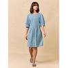 Feminin kjole i lett bomullsdenim med kort pufferm og frontknepping med ton i ton knapper. Kjolen har små legg i front, utskrådd fasong og lengde ca til ovenfor kneet. Liten logobadge i metall nede på siden