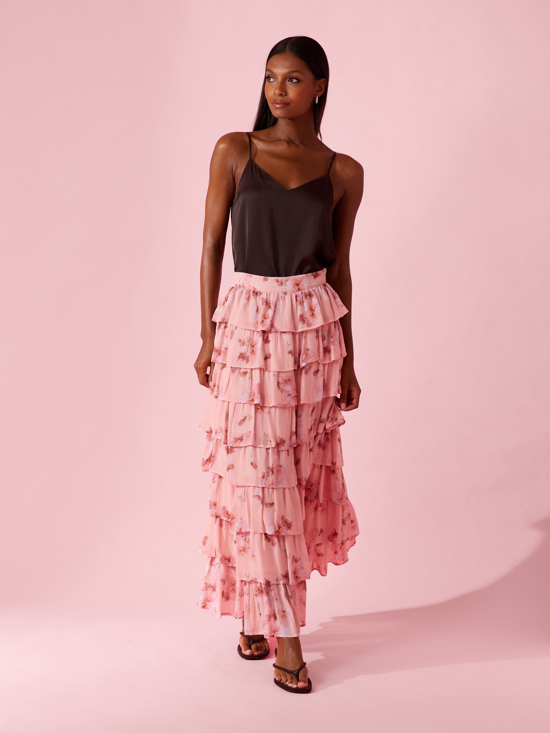 Langt kappeskjørt i lett viskose med feminint blomstermønster