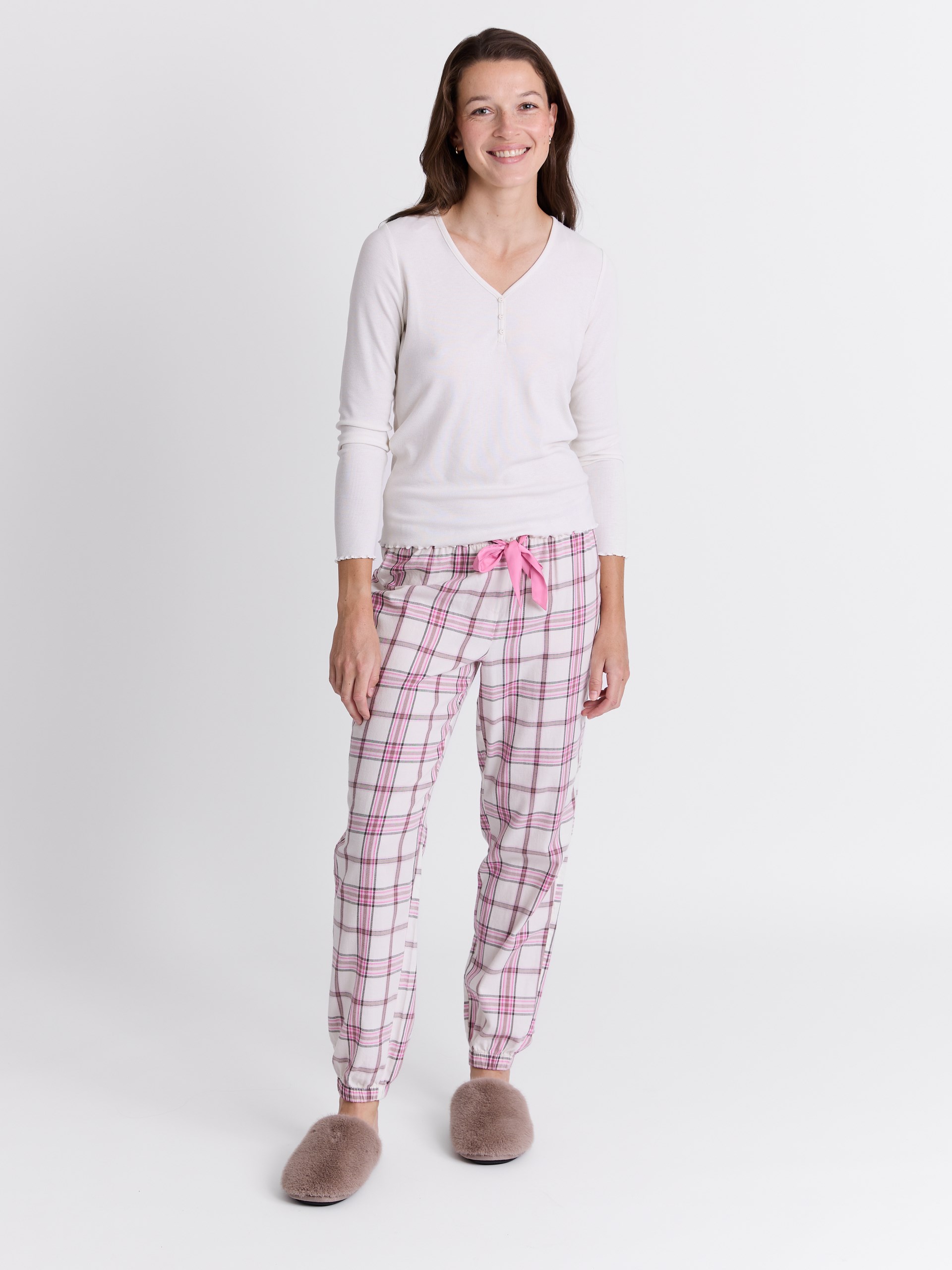 Rutet pysjbukse med elastikk og satengbånd i livet.