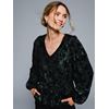 Vakker v utringet topp i myk tofarget kvalitet av paljetter og velourprint med elastisk peplumliv. Toppen er foret, har lett definert skulder med liten puff på skulderen, lang erm med volum og elastisk mansjett.