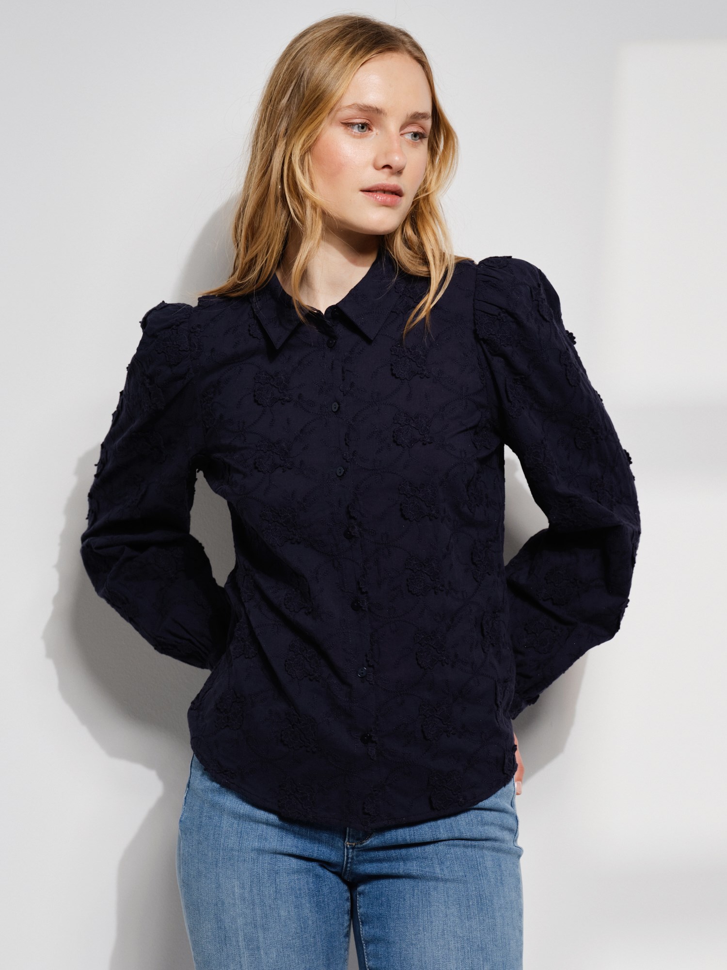 Skjorte med dekorativ 3D blonde i lett og myk bomull. Skjorten har krage og ton i ton knapper, lang erm med puff og knappet mansjett. Ledig passform og bærestykke med fold i ryggen.