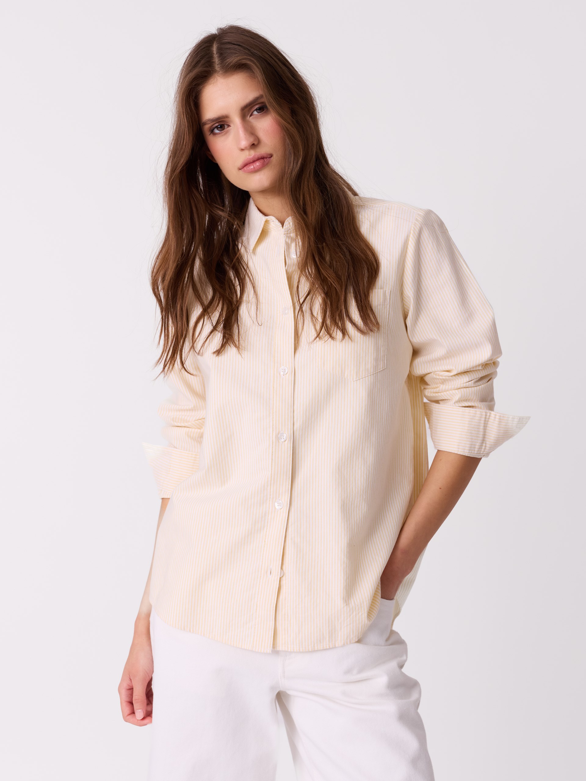Modellen er 170 cm høy og har på seg str S.Caro stripet skjorte