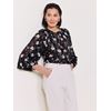 Mønstret bluse i lett strukturert kvalitet med høy andel resirkulert polyester. Blusen har en liten krage med knyting og v utringing i front, små rynker rundt kragen, samt raglanerm med volum og knappet mansjett. Ledig passform