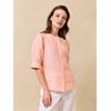 Feminin bluse i komfortabel linkvalitet med trukne knapper i front, rund hals, 3/4 lang pufferm med vidde og liten mansjett nederst. Blusen har rundet avslutning og rett passform.
