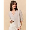 Sval og behagelig bluse i 100% lin. Blusen har v-utringing, frontknepping, 3/4 lang erm med splitt og to knapper og bærestykke bak med fold i ryggen. Ledig passform og liten sølvfarget metallogo nede til venstre