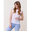 Feminin topp i lett bomulls kvalitet med broderidetaljer i blått med paljettdekor. Toppen har rund hals med knapp og splitt bak, bærestykke og korte volangermer. Rett passform.