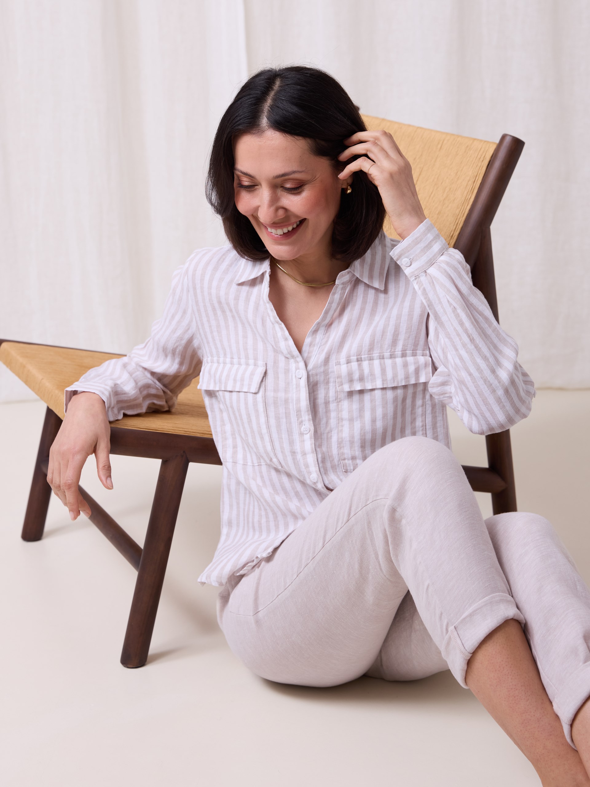 Stripet skjorte i myk og lett lin. Skjorten har lange ermer med knappet mansjett, brystlommer med klaff, og knappestolpe i front. Rett passform