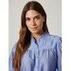 Feminin bluse i viskoseblanding med lin. Blusen har knapping i front, bærestykke med rynker foran og bak, samt pufferm med knappet mansjett. Liten rysjekant på krage og mansjett og liten logobadge i metall. Rett passform. Modellen er 173 cm høy og bruker str S.