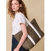 Veske i bomullstoff med skulderremmer og innvendig rutet fôr. Vesken lukkes med stropp med knapp, har en utvendig lomme med ton i ton brodert logo og en innvedig glidelås lomme. Høyde 34 cm, vidde topp 54 cm, vidde bunn 40,5 cm og bredde i bunn 15,5 cm. Bærerem 60 cm