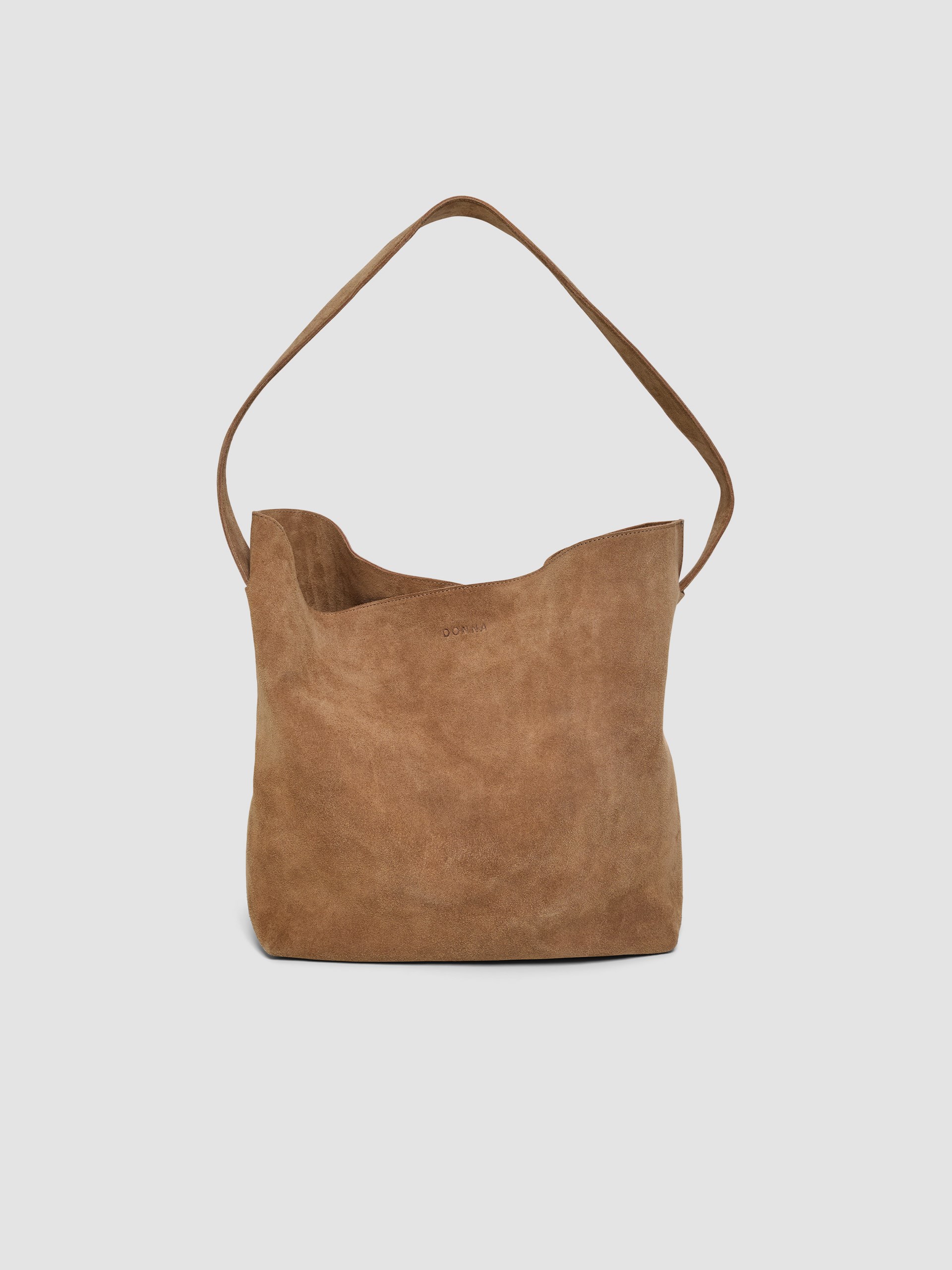 Romslig veske i mykt semsket skinn. Vesken er 15 cm dyp, 34 cm høy og 46 cm vid på toppen
