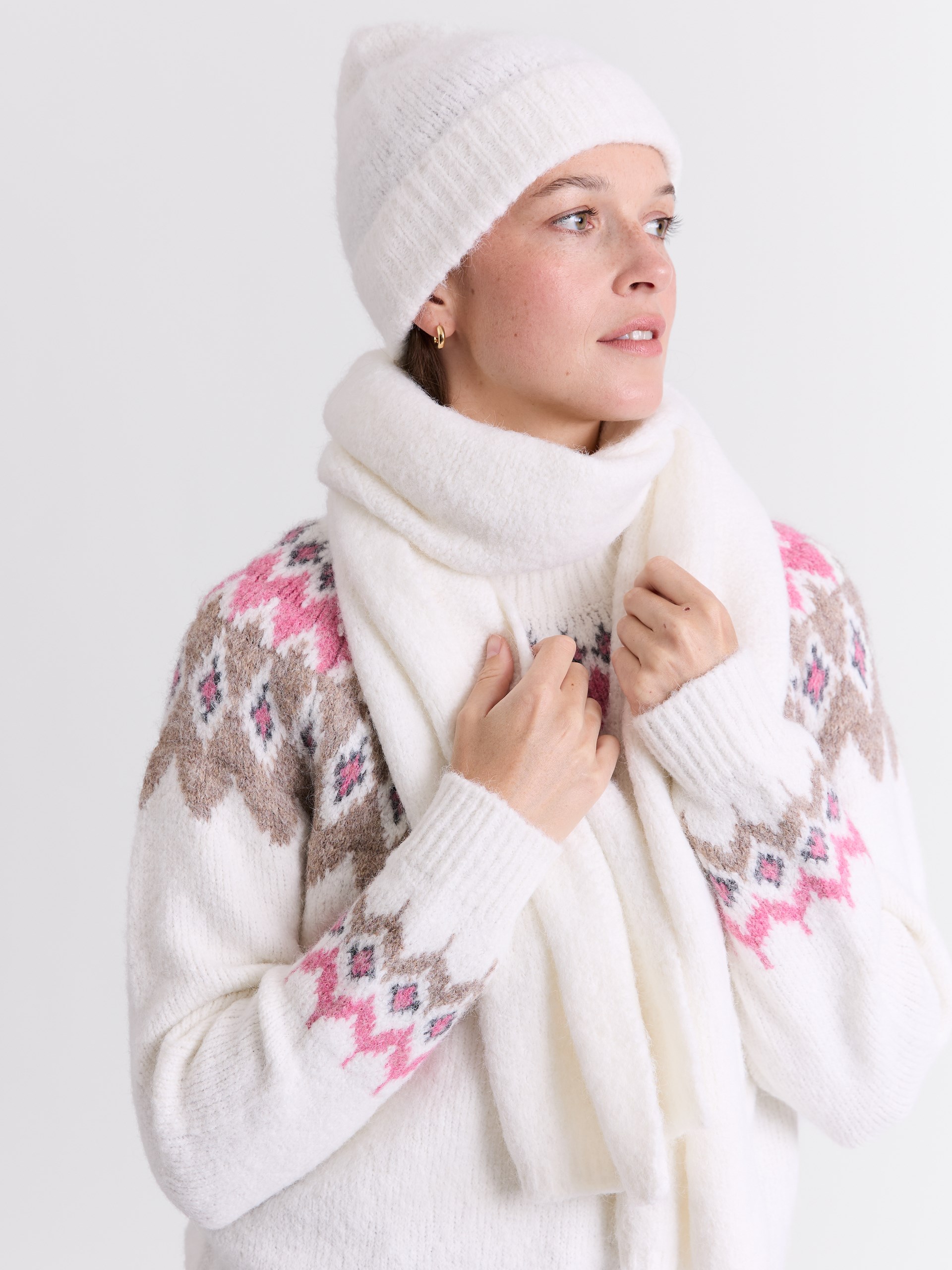 Gavesett med lue og skjerf i myk strikket kvalitet med innslag av ull.