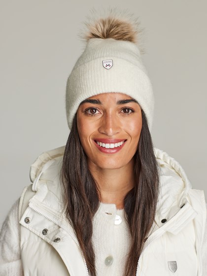 Varm og lun lue i delikat myk ullblanding. Luen har stor dusk i fuskepels, bred oppbrett og en liten metallbadge foran.