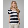 Maritim stripet t-skjorte i lekkert strukturgarn. T-skjorten er i lett og behagelig 100% bomull, har v-utringing med tynn rullekant og buet avslutning nederst. Diskre sølvfarget metallogo nede til venstre og ledig passform. Modellen er 176 cm høy og bruker str S.