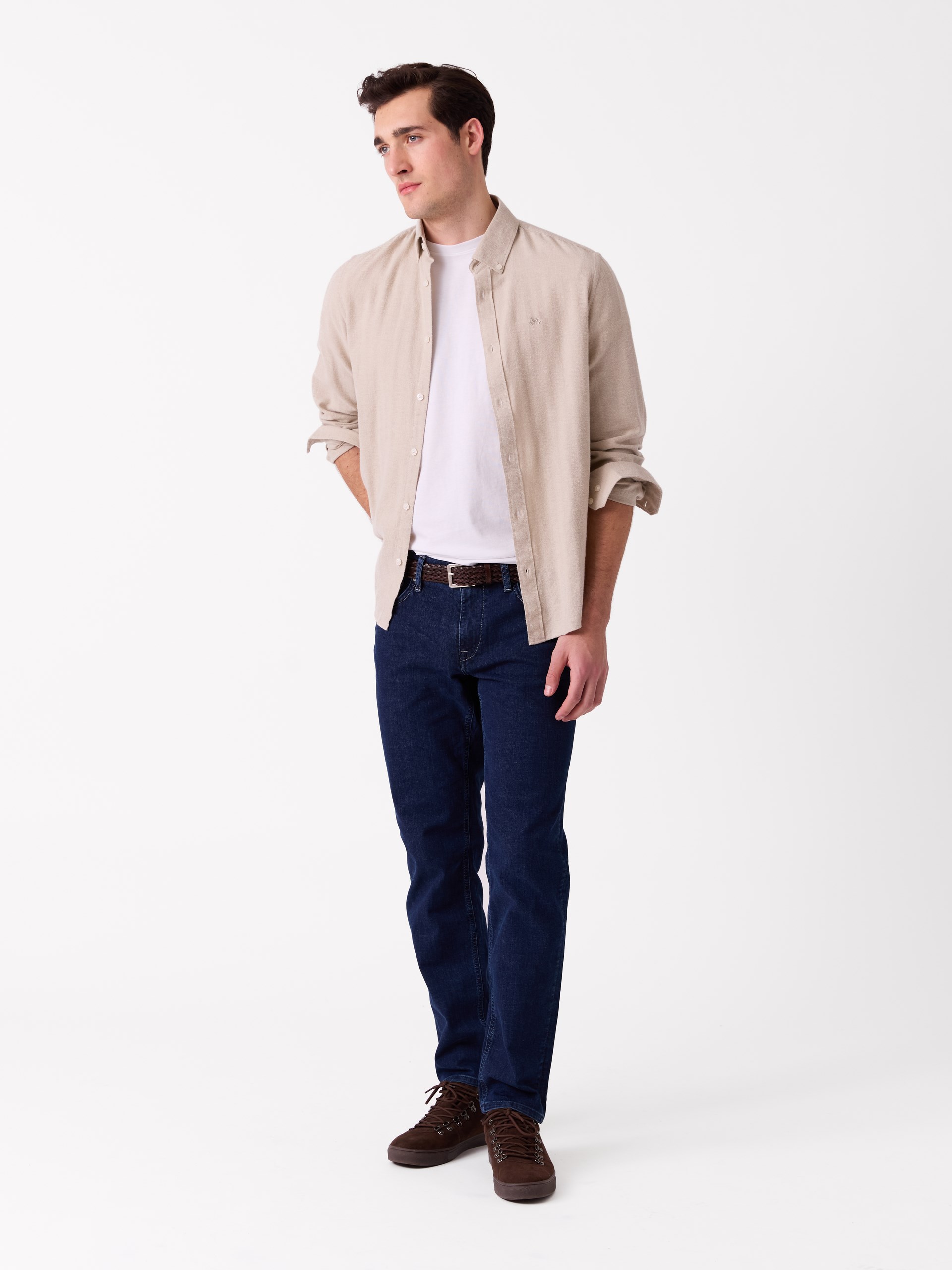 Leroy Deep Blue Stretch er en klassisk 5-pocket jeans i 10 oz mørk blå indigo denim med comfortstretch og et lett steinvasket uttrykk med slitasje jevnt over. Buksen er en "slim fit" med normal setevidde, normal livhøyde og smale ben som passer til de som ønsker en smalere silhuett. Glidelåsgylf med knapp i front og en logobadge i livet bak