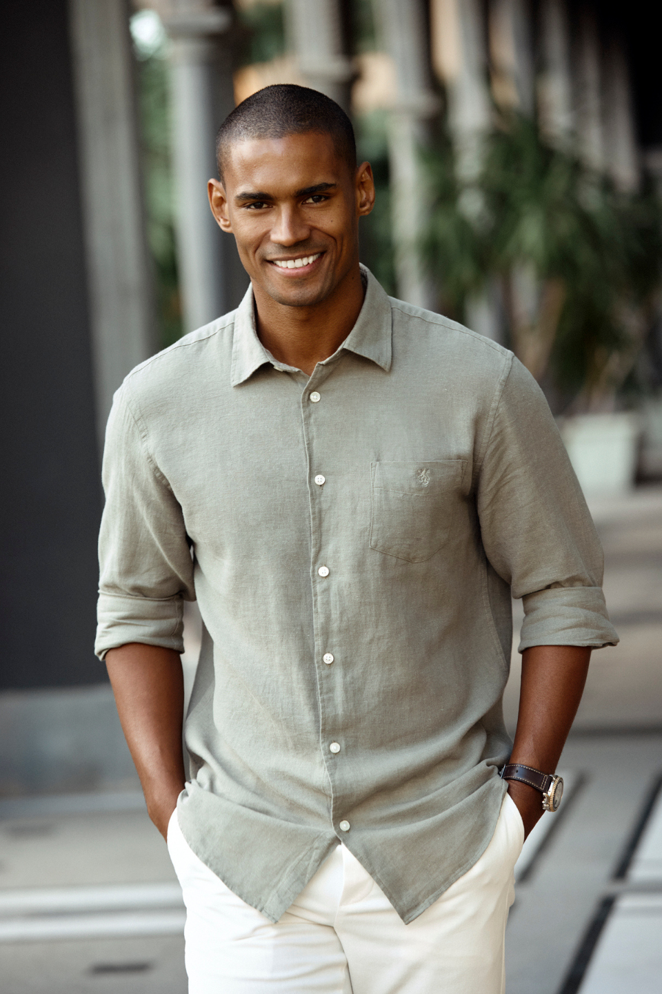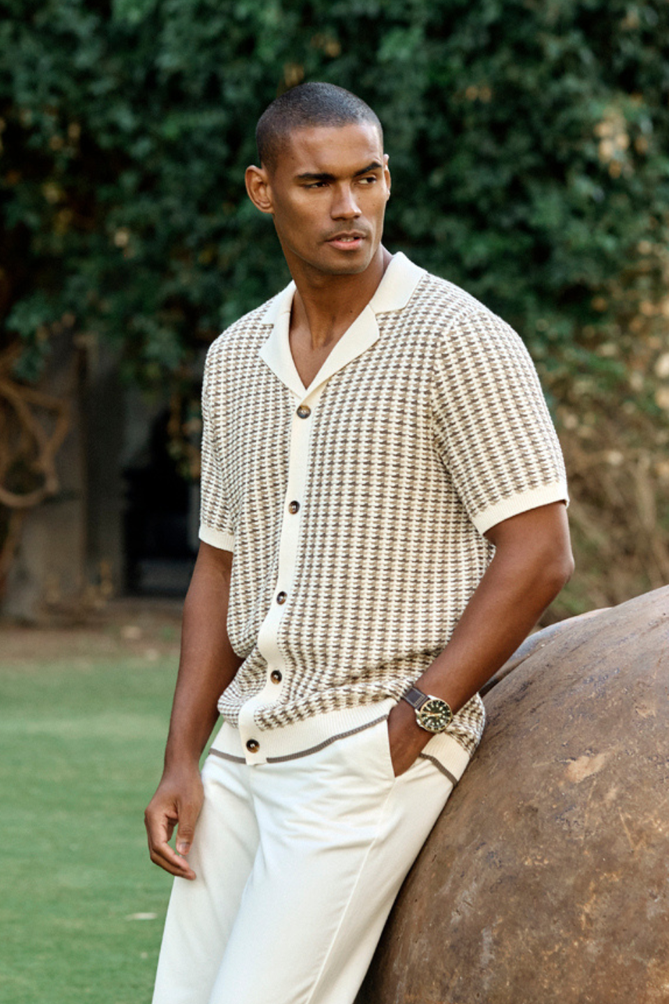 Klassisk bestefarstrøye i myk kvalitet med vevet bånd i knappestolpen. Trøyen har en logobadge på ermet og en liten tab i siden. Regulær passform. Modellen er 185 cm høy og har på seg str L.