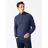 Genser med ton i ton mønsterstrikk og halvhøy glidelåskrage samt ribbestrikkede vrangborder.