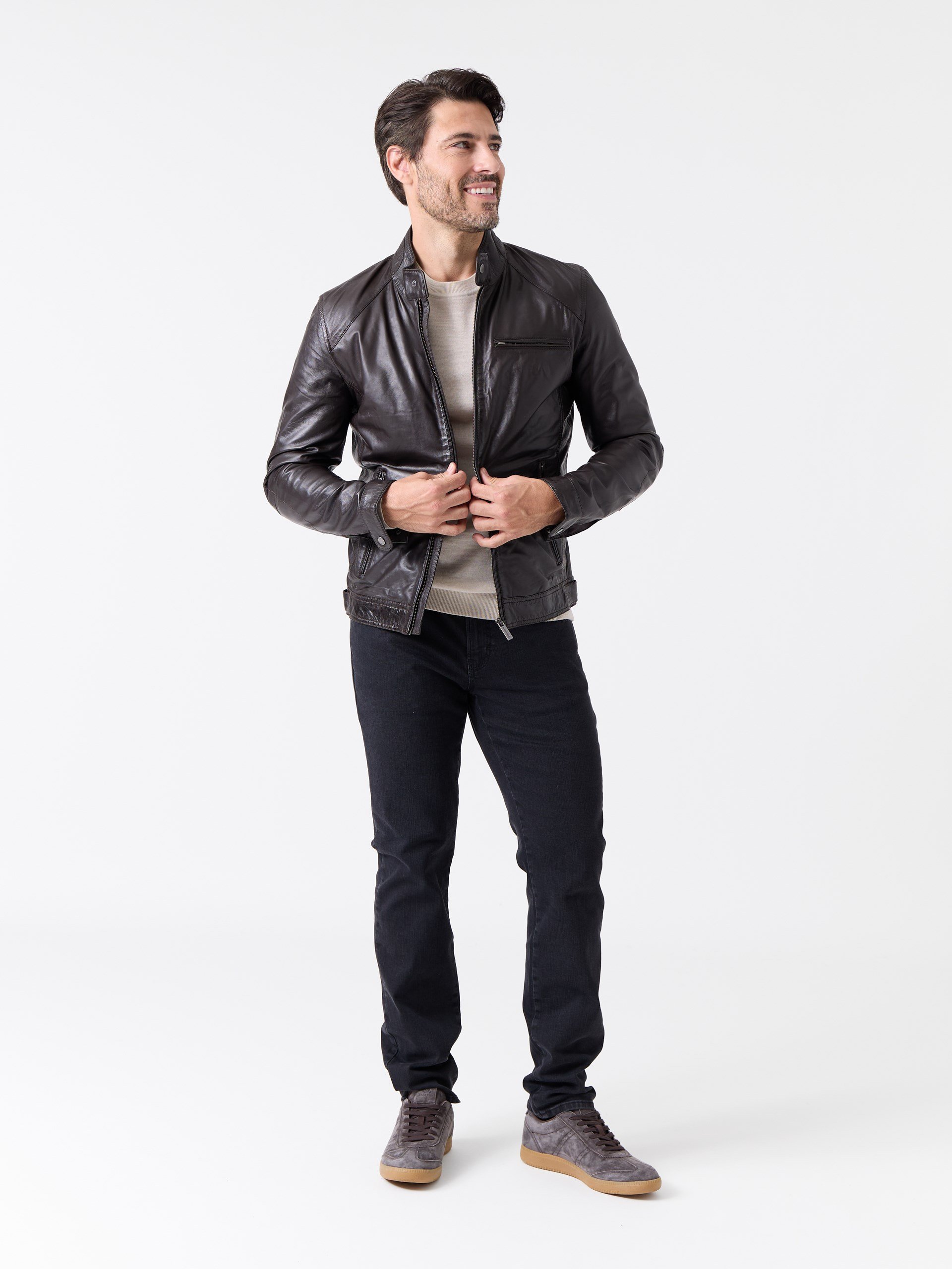 Skinnjakke i mykt lammeskinn. Jakken har glidelåslukning, smal passform med liten krage, fine sømdetaljer, regulering i siden og justerbar mansjett med knapp. To innerlommer og 3 ytterlommer med glidelås. Modellen er 188 cm høy og har på seg størrelse L.