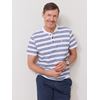 Kortermet stripet bestefarstrøye i slubyarn av god bomull. Bestefarstrøyen har knappestolpe med brune knapper og ett lite broderi på brystet.